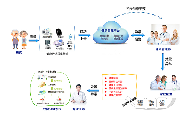 家庭醫(yī)生簽約平臺是實施家庭健康管理的服務(wù)平臺,它在社區(qū)范圍內(nèi),以家庭為單位,由社區(qū)衛(wèi)生服務(wù)中心和區(qū)域醫(yī)療衛(wèi)生協(xié)同服務(wù)體系提供支撐,建立居民健康檔案為分級診療制度建設(shè)逐步形成基層首診、雙向轉(zhuǎn)診、急慢分治、上下聯(lián)動的分級診療和就醫(yī)真正政 策落地模式,全方位的生命體征采集和檢測,線上線下的數(shù)據(jù)干預(yù),為家庭成員提供綜合、連續(xù)、有效的基本衛(wèi)生服務(wù)。