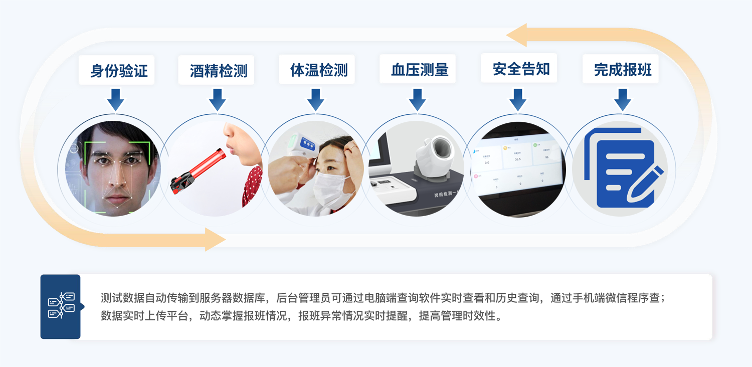 崗前健康檢查一體機是一種用于進行員工健康檢查和篩查的設備,可以通過指紋識別、人臉識別等方式快速登錄,并可準確地檢測員 工的健康狀況,包括 血壓、心率、酒精、體溫、血氧 等多個項目,對于符合上崗健康狀態(tài)得員工允許考勤打卡。