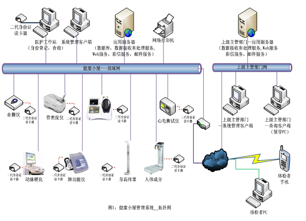 社區(qū)健康小屋一體化實施方案,包含有一臺主控計算機、一個由該主控計算機控制的身高體重儀、血壓儀、血糖儀、肺功能儀、動脈硬化檢測儀、骨密度檢測儀、心電儀