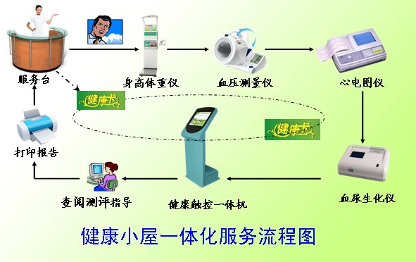 健康小屋操作流程 1、社區(qū)老人先到服務(wù)臺憑借一卡通標(biāo)簽換取“身份識別卡”; 2、將卡在其中之一的體檢測評單元的登陸裝置正確識別后,卡內(nèi)加密數(shù)據(jù)經(jīng)由主機通過網(wǎng)